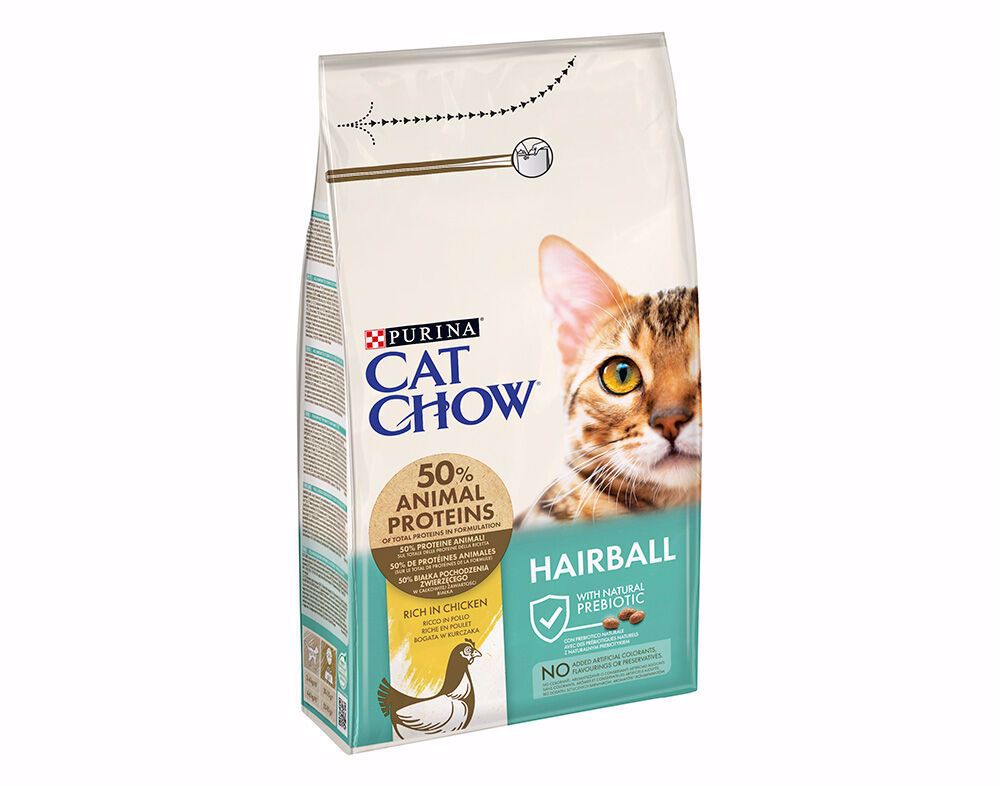 CAT CHOW® Hairball Control, é um alimento completo para gatos que inclui Naturium™, formulado especialmente com fontes de fibra, provado que removem o dobro do pelo do estômago.