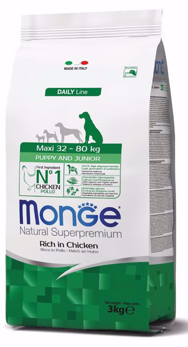 Monge Natural Superpremium Maxi Puppy & Junior é um alimento completo para cachorros de porte grande. Este alimento garante o bem-estar do seu animal, graças ao elevado nível de nutrientes de qualidade, tendo como principal ingrediente o frango é também enriquecido com XOS (Xilo-oligossacarídeos), a última geração de prebióticos que mantém o bem-estar intestinal. Contém extrato de alcachofra, equinácea, oregão e alho que estimulam o sistema imunitário e protegem o fígado. Condroitina, glucosamina, cálcio e fósforo que ajudam nas articulações e no desenvolvimento muscular.